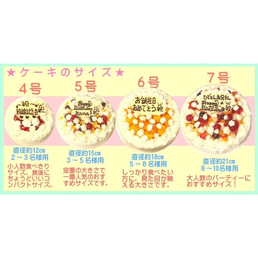 デコレーションケーキ用ケーキ型6号、紙のケーキ型の中で一番大きなサイズでした。 6号サイズのレシピ付きなのでケーキの大きさに合わせたレシピを探さなくてもこのケーキ型を 買っちゃえば大丈夫! ケーキ作りを手助けしてくれるアイテムもたくさんサイズ 6号(18cm) 5~8名様向け オプションについて ナンバーキャンドル 1個 ¥123 フォトケーキの写真 チョコプレート(メッセージ) メッセージ内容 無料ローソク メッセージ ご希望のメッセージをお描き致します。6号直径18センチ 7号直径21センチ 8号直径24センチ うっかり直径が何センチか忘れても、慌てず号数に3を掛けてください。 サイズごとの、人数の目安 サイズがわかっても、そのケーキが何人分の目安なのかも予測が難しいですね。